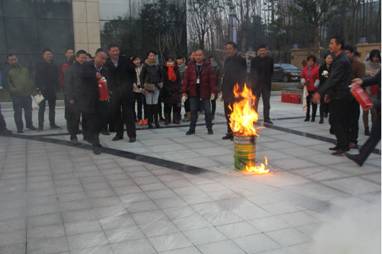 随后集团公司组织员工在建投大厦内部开展消防应急预案演练。随着急促紧促的警报声响起,顿时消防通道内浓烟滚滚,大厦内员工迅速在疏散员引导下弯着腰,用毛巾捂着嘴、紧靠墙边,从大厦南北二侧安全通道快速有序的向安全地带疏散。接着,全体员工在建投大厦南广场开展了灭火器扑救油盆火灾的实地演练。