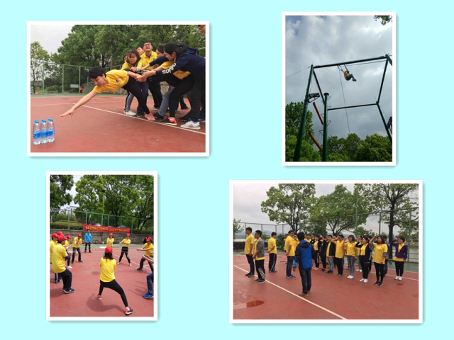 为期一天的拓展训练内容包括“破冰起航”、“群龙取水”、“鼓动人心”、“智力电网”、“高空跳杆”等活动项目。在“群龙取水”比赛中,大家默契十足,合作精神展现的淋漓尽致,通过队友的帮助,冲过重重阻碍,终于成功取水,比赛紧张,扣人心弦;在“鼓动人心”比赛中,队员们统一步调,不断尝试、不断总结、不断进步,团队合作精神贯穿始终;在“智力电网”比赛中,为了集体荣誉,大家精确计算,合理谋划,所有队员不怕脏不怕累,都以十足的拼搏精神全力以赴,活动场上口号声、欢呼声、呐喊声、掌声交织成一片;在“高空抓杆”比赛中,队员们以最大的努力克服心里障碍、发掘自身潜力,冷静面对、挑战自我,深刻体会了团队协作、信任互助和自信的重要性,承受住压力,战胜了困难,用汗水书写了弘扬五四的华彩乐章。